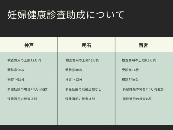 今回は、神戸・明石・西宮の妊婦健康診査費用の助成を比較します。